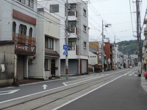 鴨部から朝倉駅前までの5つの電停はノーガード電停。中でも上り下りどちらの乗り場も道路上にあるのが、曙町電停です。