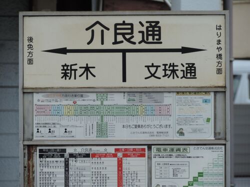 以前にも書きましたが、とさでん交通の電車は高知市内の中心部の運賃が200円均一になっています。その西の端は曙町東町、そして東の端が、この介良通電停です。