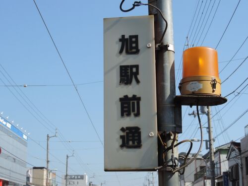 ほとんどのところで片側二車線になっている高知市内の電車通り。ただ、西の旭町付近では拡幅が進んでおらず、片側一車線+αの通りに昭和後半の雰囲気を伝える街並みが今も残っています。旭駅前通の停留所は、その真ん中にあります。