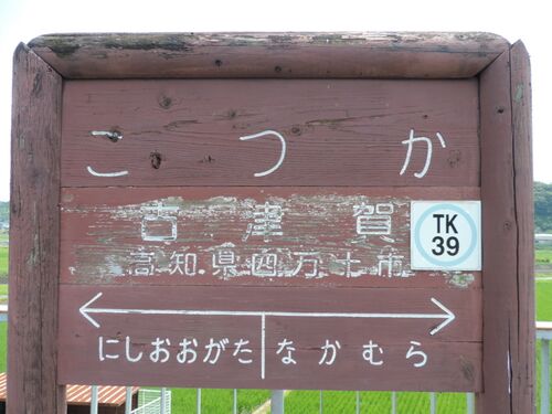 土讃線、中村線と、山や話の中や海のそば、田舎の風景を走り続けてきた列車の目の前に、久しぶりに市街地が広がります。その中心部の中村も近づいたところで、普通列車は築堤上の古津賀駅に停車します。
