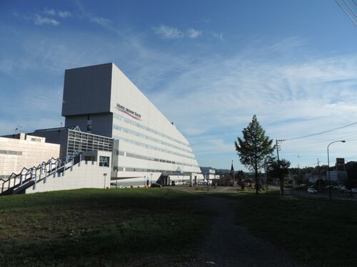 列車の出発時間まで間があるので、夕張駅近くのセイコーマートでドリンクを調達。店を出て見ると、JR夕張駅は巨大なリゾートホテルの脇、ほとんど見過ごしてしまいそうな小ささです。この街にとっての鉄道も、このぐらいの存在なのでしょうか。