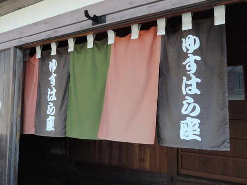 役場から少し歩いて、劇場「ゆすはら座」へとやって来ました。70有余年の歴史を持つ木造の芝居小屋です。暖簾がいかにもな芝居感を醸し出しています。