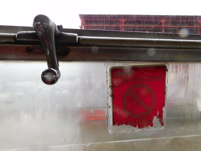 禁煙のステッカーが残っていますが、実は後ろの座席だとタバコが吸えたようです。まぁ昔のことですからね。私が子どもの頃も、国鉄(!)の電車は西明石を過ぎたら禁煙区間が終わりでしたし。