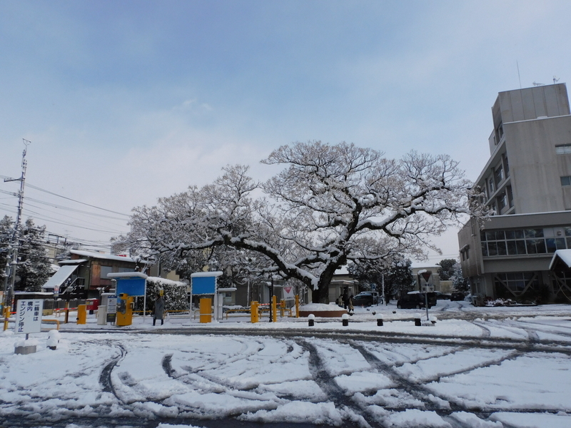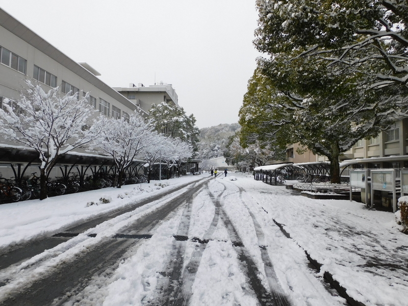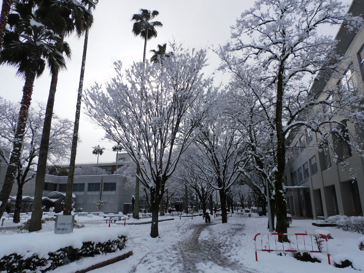 幸いにしてとさでんの路面電車が動いていると知ったので、電車で朝倉へ。たどり着いてみると、当たり前ですが、キャンパスも雪景色でした。