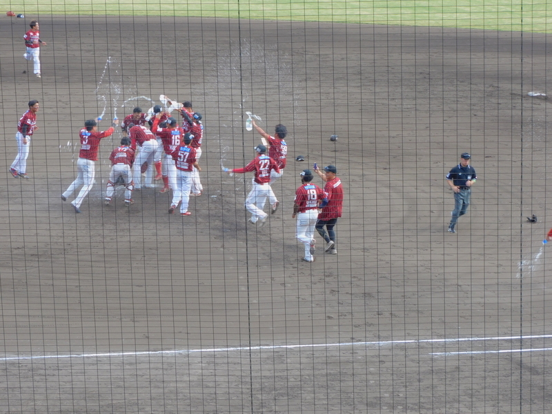 2死1塁で片山(元東北楽天)の打席に期待がかかる場面。しかし、山本がここで盗塁を試みて失敗。これでゲームセットとなり、火の国サラマンダーズが2年連続2回目のグランドチャンピオンシップ優勝を勝ち取りました!