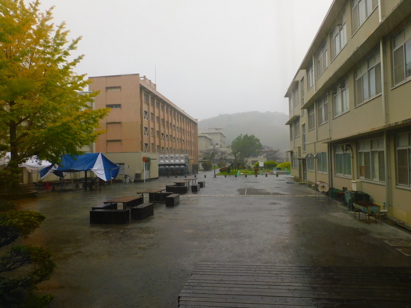 高知大学朝倉キャンパス、地域協働学部棟の中庭です。本来ならここにテントが並んでいるはずなのですが、雨であらかた撤収しています。