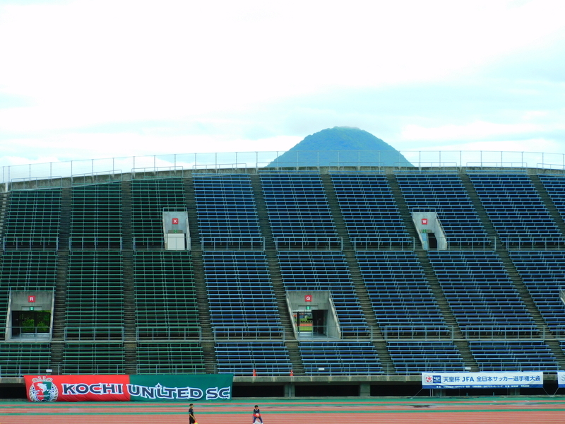 今回の試合ではメインスタンドのみが開放されています。無人のバックスタンドの上に讃岐富士が顔を出しています。