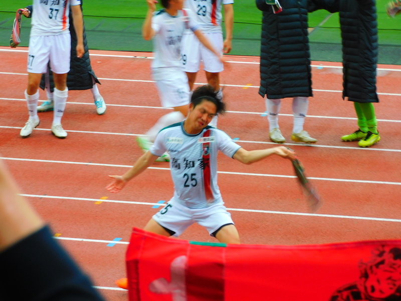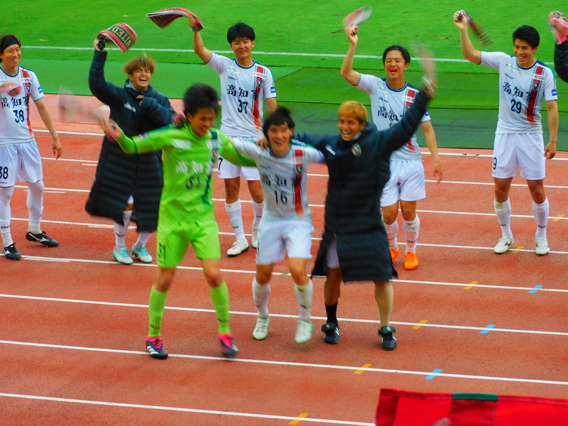 高知サポーターが集まる中、高知の面々が勝利の報告にやって来ます。